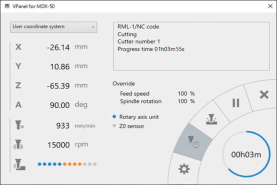 集成于設備單元前端的控制版面幾乎可以控制所有操作,用戶無需往返于電腦與設備之間。VPanel界面可與MDX-50無縫對接,方便用戶調(diào)整主軸轉速和速率。
